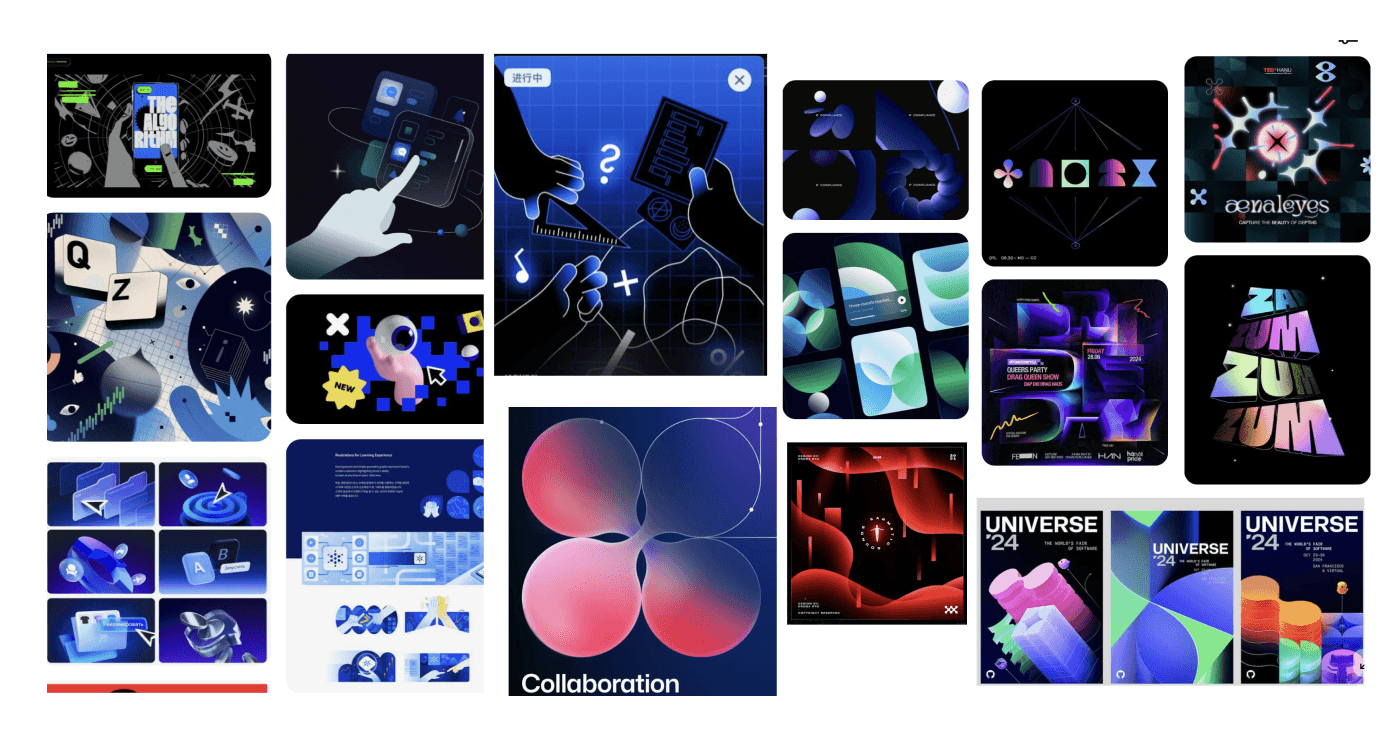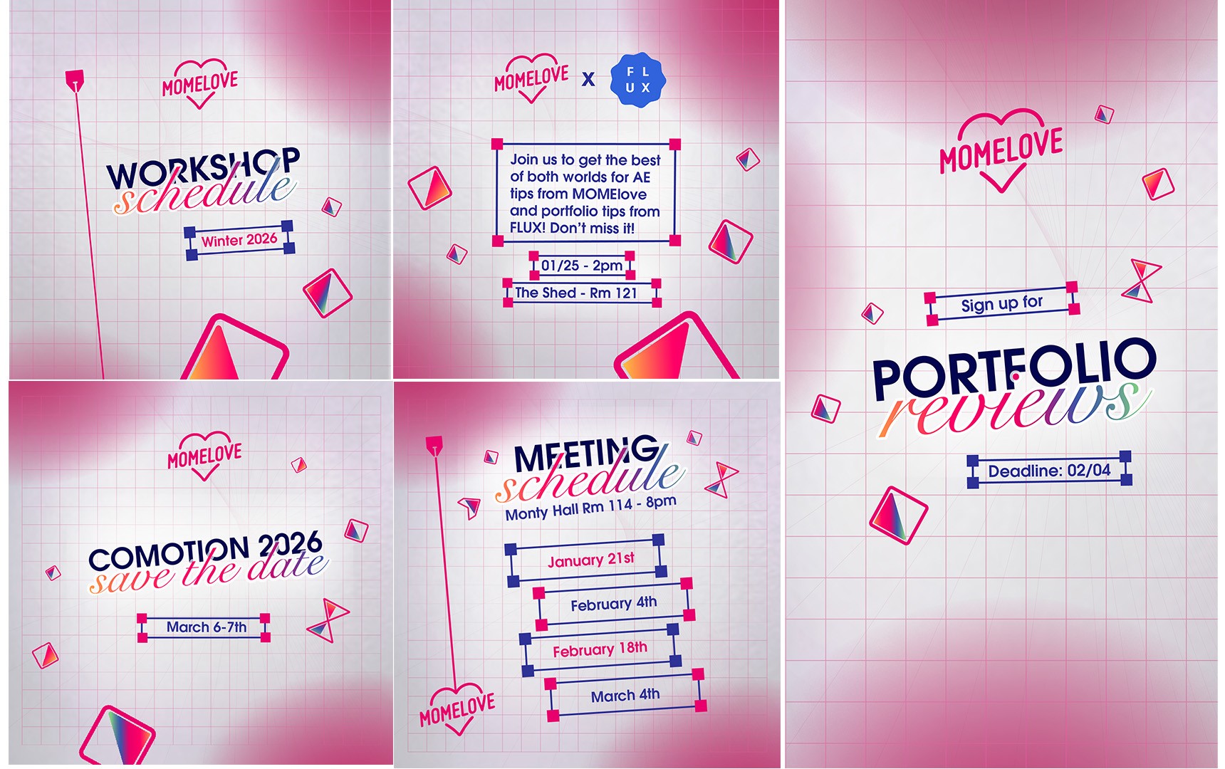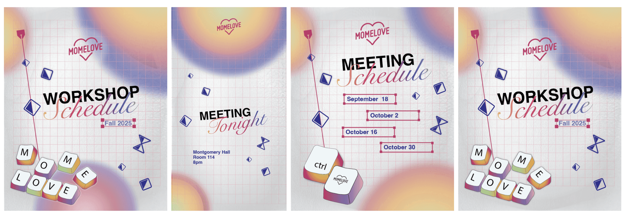 Because these posts would be seen by both students and alumni, we aimed to capture their attention with designs that reflected current motion design trends—such as gradients, stylized illustrations, playful typography, and subtle abstraction. At first, we explored a style with darker backgrounds, gradients, and thin line work. While visually appealing and on-trend, this approach ultimately did not align closely enough with MomeLove’s established branding, so we decided to shift our direction.